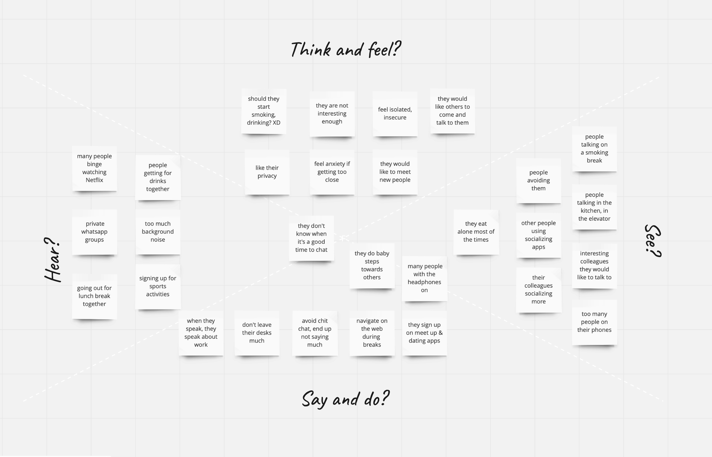 Before jumping into design ask first. Research was based on surveys, interviews and investigations with young and middle aged coworkers on the different aspects of socializing at an office job outside of the direct team, across departments and companies in cases of coworking spaces.